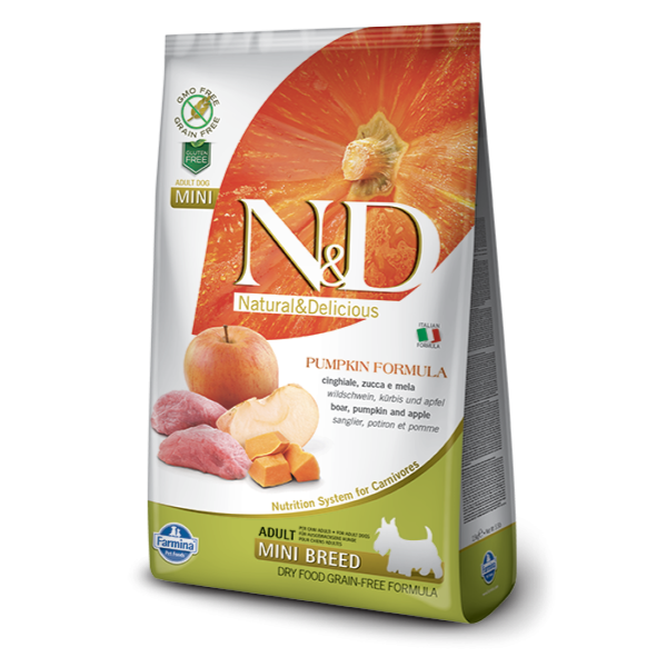 N&D Pumpkin Mini Wild Boar & Apple je inovativna linija suve hrane italijanskog brenda Farmina, posebno formulisana da zadovolji nutritivne potrebe odraslih pasa malih rasa. Ova receptura bez žitarica (Grain-Free) fokusira se na visoki procenat proteina životinjskog porekla i pažljivo odabrane prirodne sastojke.