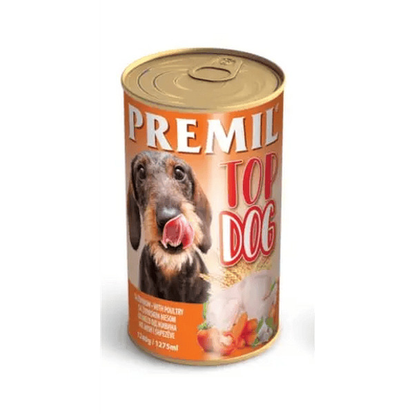 PREMIL TOP DOG chicken je vlažna, konzervirana hrana namenjena psima. Predstavlja kompletan i izbalansiran obrok za odrasle pse svih rasa. Obogaćena je vitaminima i antioksidansima prirodnog porekla.