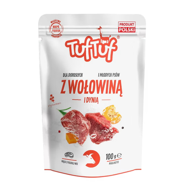 TUF TUF sos za pse je ukusna i kompletna vlažna hrana pogodna za sve rase pasa. Kombinacija govedine i bundeve pruža balansiran nutritivni obrok bogat proteinima i prirodnim vlaknima, dok pirinač i repičino ulje olakšavaju varenje i doprinose zdravlju pasa. Pakovanje od 10x100g omogućava praktičnu upotrebu kod kuće ili tokom putovanja.